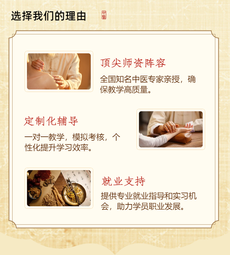 擅长推拿、正骨复位、针灸等中医技能培训,针对健康养生行业,有着完善的专